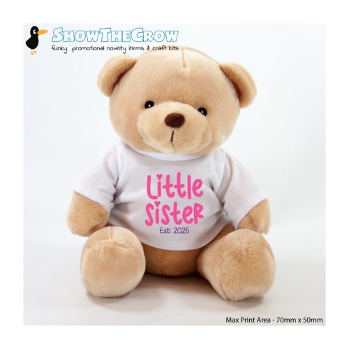 ‘Little Sister Est 2026‘ 25cm Lexxie Bear with Text Gift Keepsake Memory Bear Birthday